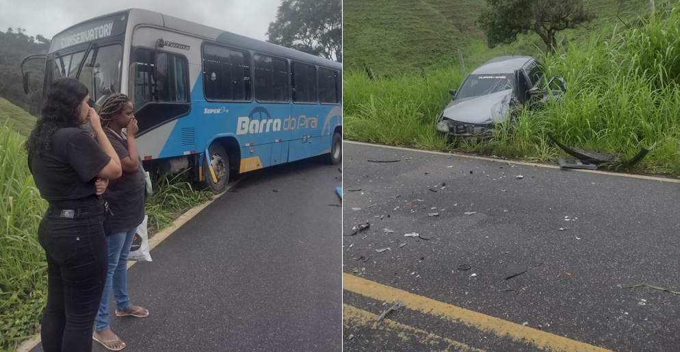 Acidente entre coletivo e carro deixa dois feridos na RJ-137 que liga Barra do Piraí a Ipiabas, RJ