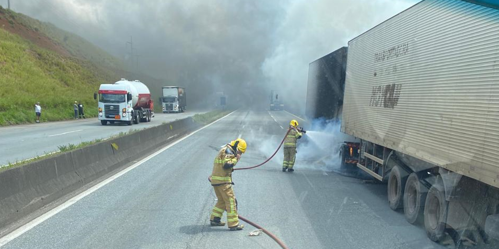 Incêndio em bitrem carregado com areia especial para gatos mobiliza Bombeiros na Rodovia Fernão Dias, em Extrema, MG