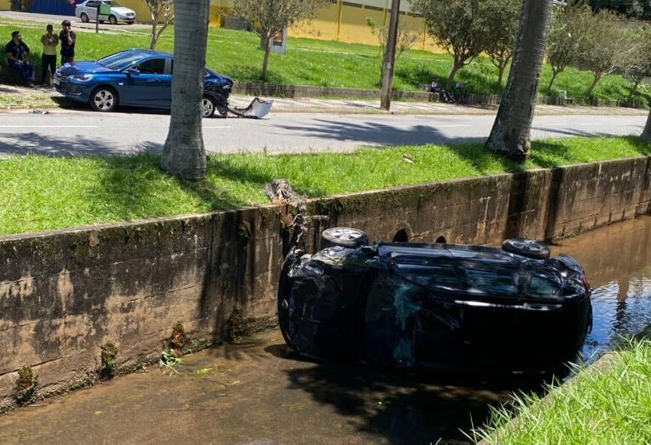 Na manhã desta quarta-feira (11), um acidente chamou a atenção no Centro de Caxambu. Um veículo modelo Duster caiu dentro do Rio Bengo, que corta a Avenida Ápio Cardoso, após colidir com outro carro, um Ônix, que estava estacionado na via.