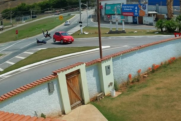 Nas imagens, é possível ver a motocicleta atravessando o trevo quando é atingida lateralmente pelo carro. Com a força da batida, o condutor e a passageira foram arremessados ao chão. Populares que estavam nas proximidades correram para ajudar e acionaram o socorro.