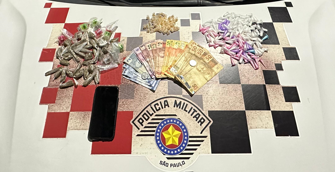 O adolescente estava em uma bicicleta e carregava, na cestinha, uma sacola preta com 49 porções de crack, 47 porções de maconha e 129 porções de cocaína. Na busca pessoal, os policiais encontraram ainda um aparelho celular, uma porção adicional de maconha e R$ 468 em notas diversas, valor compatível com a atividade ilícita. Questionado, o jovem confessou a prática.