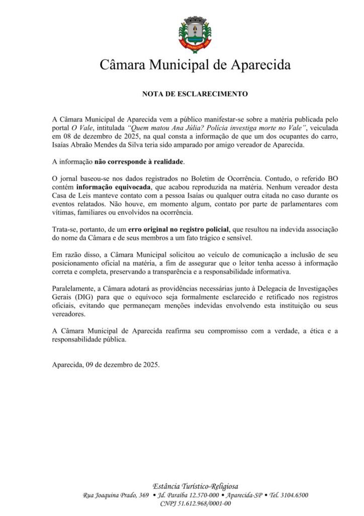 A Câmara Municipal de Aparecida emitiu nesta terça-feira (9) uma nota de esclarecimento a respeito da repercussão de reportagem publicada pelo portal O Vale, intitulada “Quem matou Ana Júlia Jacinto Resende?” (08 de dezembro de 2025), que sugeria que um dos ocupantes do carro em que a jovem foi morta teria recebido apoio de “amigo vereador” para buscar socorro. Segundo a Câmara, essa informação não corresponde à realidade.