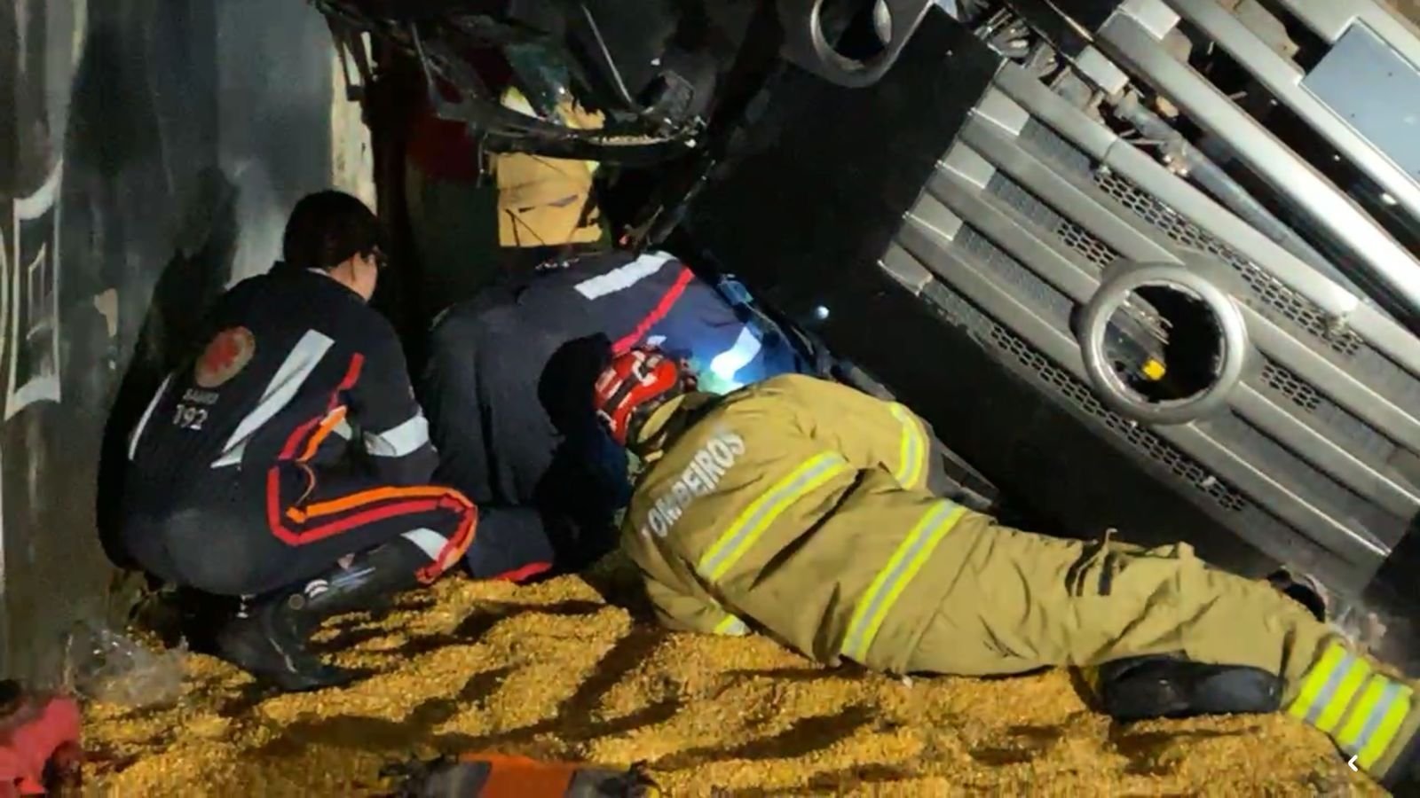 Com o impacto, a carga de milho se espalhou pela pista, houve vazamento de combustível e a queda de um poste de energia elétrica, aumentando o risco no local.