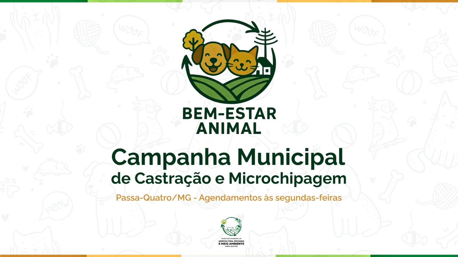 A Prefeitura de Passa-Quatro está promovendo a campanha Bem-Estar Animal, que oferece castração gratuita e implantação de microchip para cães e gatos. A iniciativa também garante o registro dos animais no sistema municipal, em conformidade com a Lei nº 21.970/2016.