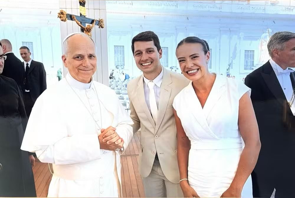 A engenheira Jéssica Carneiro, natural de Cruzeiro (SP), e o empresário Kaíque Martinho, de Aparecida (SP), viveram um momento inesquecível durante a lua de mel na Europa: o casal foi abençoado pessoalmente pelo Papa Leão XIV, no Vaticano, durante a tradicional cerimônia Sposi Novelli, voltada para recém-casados.
