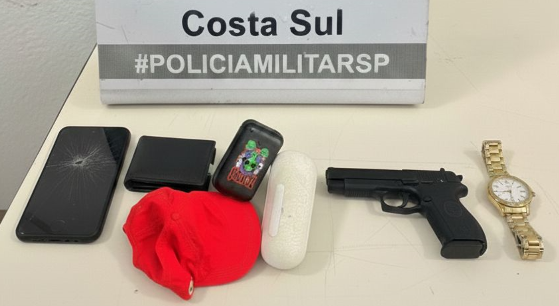 Mesmo após ser atingido, o homem continuou a fuga, entrando em estabelecimentos comerciais da região e correndo em direção à praia. Com o apoio de outras viaturas, a Polícia Militar conseguiu montar um cerco tático que resultou na localização do suspeito caído na Rua Benedito Vitorino dos Santos. Com ele foi apreendido um simulacro de arma de fogo, utilizado para intimidar vítimas e tentar confundir a ação policial.