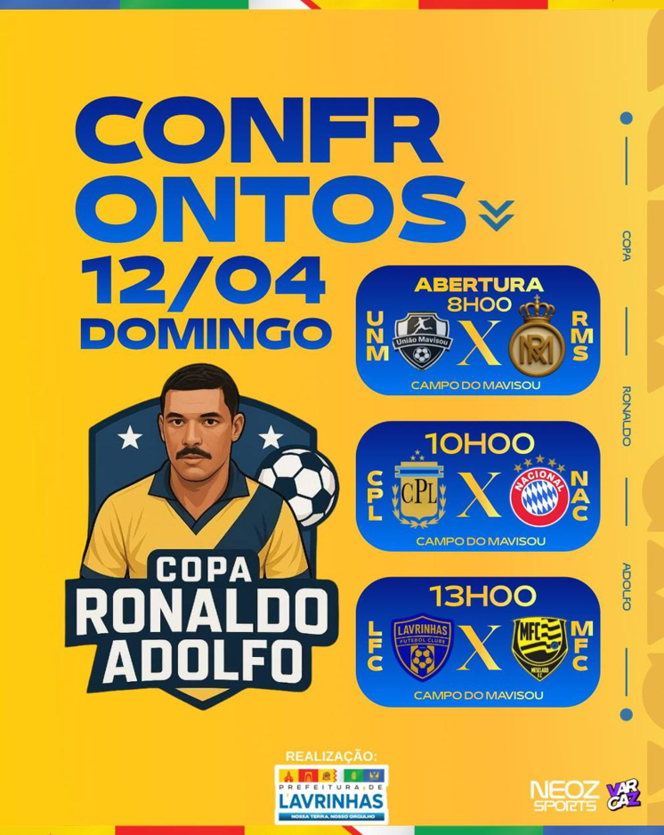 A Prefeitura de Lavrinhas, por meio da Secretaria de Esporte e Lazer, realiza neste domingo (12) a abertura de mais uma edição da tradicional Copa Ronaldo Adolfo de Futebol Amador, um dos principais campeonatos do calendário esportivo local.