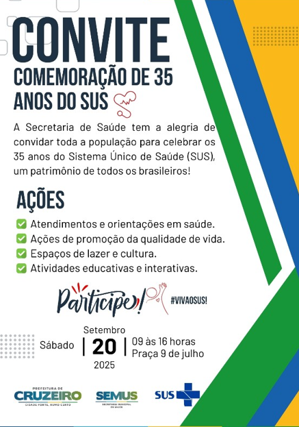 A Secretaria Municipal de Saúde de Cruzeiro promove neste sábado (20) uma programação especial em comemoração aos 35 anos do Sistema Único de Saúde (SUS), considerado um patrimônio de todos os brasileiros.