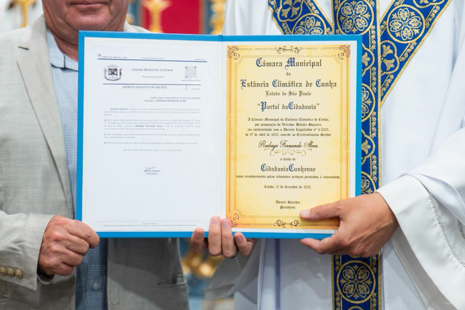 O município de Cunha oficializou a entrega do Título de Cidadão Cunhense ao Padre Rodrigo, em uma cerimônia que marcou o reconhecimento público pela trajetória de dedicação e liderança espiritual do sacerdote na cidade.
