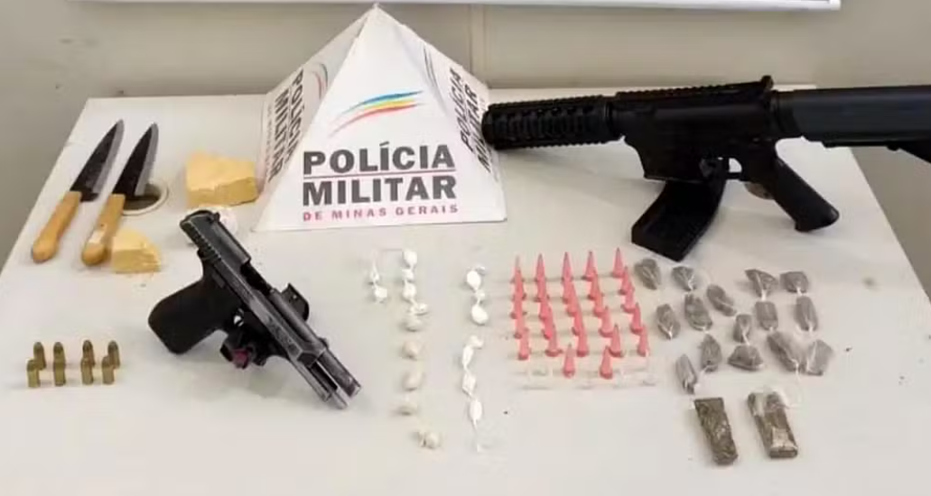 Além das prisões, a Polícia Militar apreendeu drogas e armas no local, incluindo:
