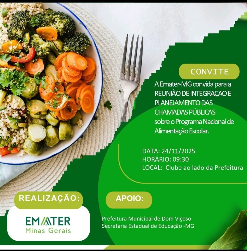 A Prefeitura de Dom Viçoso, em parceria com a EMATER-MG e a Secretaria Estadual de Educação de Minas Gerais, realizará no dia 24 de novembro de 2025, às 9h30, a Reunião de Integração e Planejamento das Chamadas Públicas do Programa Nacional de Alimentação Escolar (PNAE).