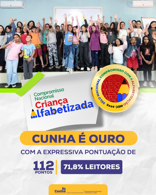 A Prefeitura de Cunha recebeu nesta semana a confirmação de uma conquista histórica para a educação municipal. O Ministério da Educação (MEC) concedeu à cidade o Selo Ouro no âmbito do Compromisso Nacional Criança Alfabetizada, certificação máxima destinada aos municípios que cumprem com excelência as metas de alfabetização na idade certa.