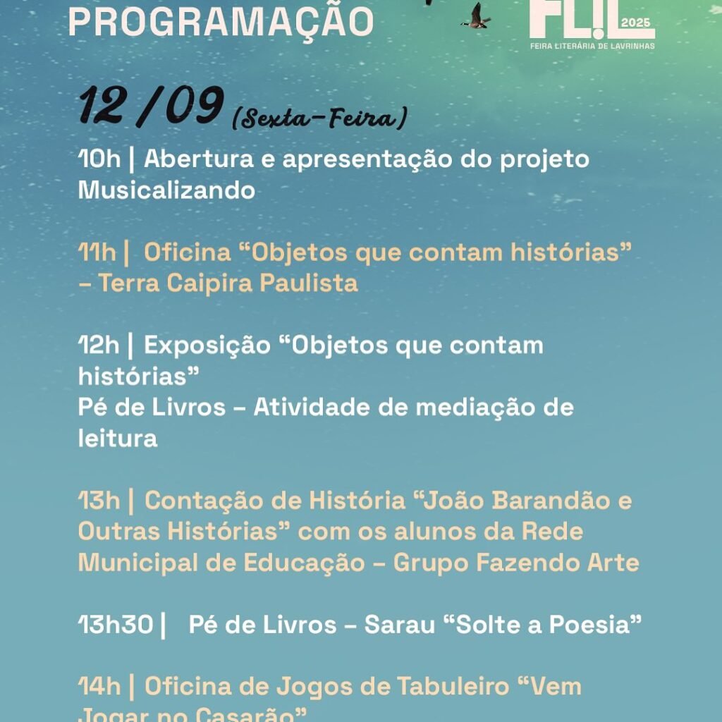 A programação inclui oficinas, contação de histórias, saraus, exposições, mesas de debate, apresentações artísticas e shows musicais. Escritores, artistas e a comunidade irão se reunir no evento, que busca incentivar a leitura e valorizar a cultura regional.