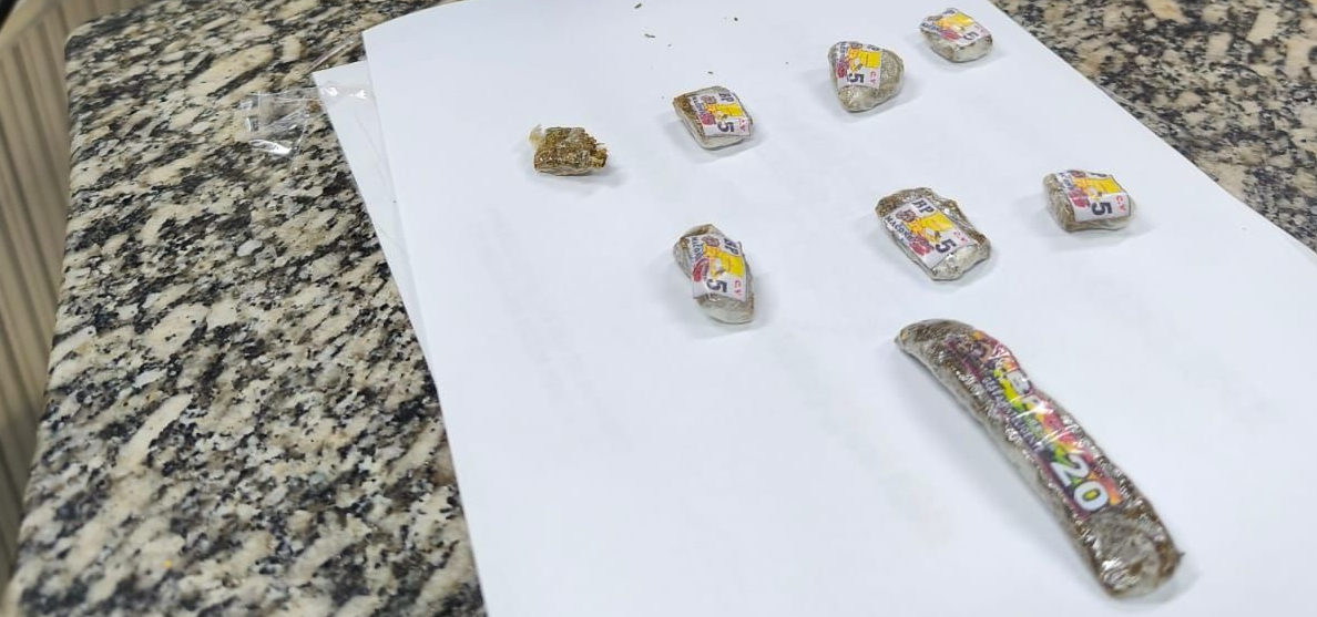 Ao chegarem ao local, os policiais encontraram Carlos Henrique da Silva visivelmente alterado. Durante a abordagem, ele foi flagrado com oito embalagens de maconha.
