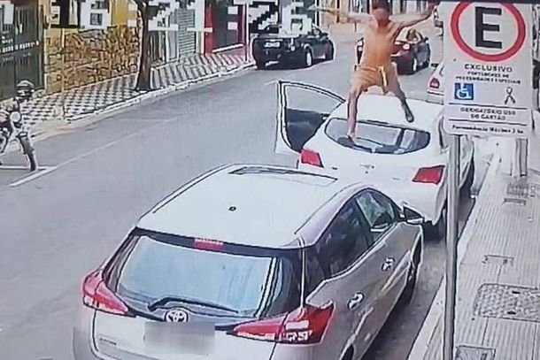 Na sequência, ele foi flagrado saltando sobre dois veículos estacionados. A condutora de um Toyota Yaris prata, de 38 anos, informou que o carro sofreu amassados no capô e no teto. Já um homem de 55 anos, que estava dentro de um Chevrolet Onix branco, presenciou o autor pular sobre seu automóvel, que também teve danos semelhantes.