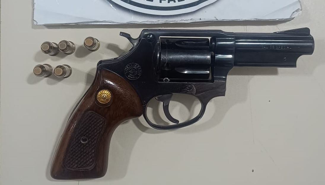 Com base nas informações repassadas pelas testemunhas, as equipes da PM iniciaram buscas e localizaram o suspeito. Durante a abordagem, os policiais encontraram em sua cintura um revólver oxidado calibre .38, com numeração suprimida e cinco munições intactas.
