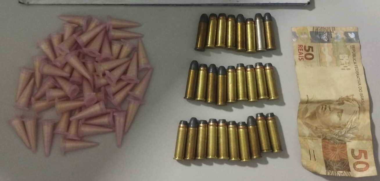 Com o suspeito, foi encontrada uma pochete contendo uma quantidade significativa de itens ilícitos: 27 munições intactas de calibre .38, 51 microtubos com cocaína e R$ 50,00 em dinheiro. O armamento utilizado para os disparos, no entanto, não foi localizado.