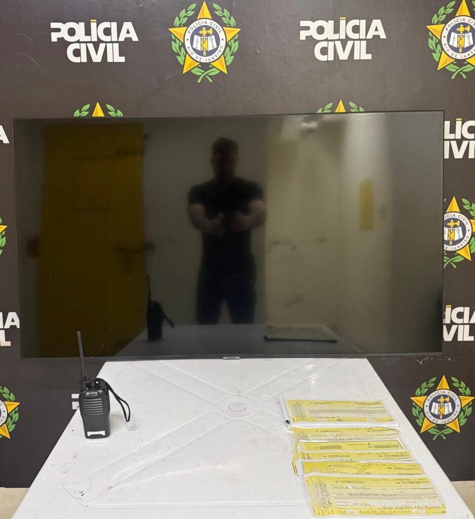 Na residência do acusado, os agentes apreenderam uma televisão de 50 polegadas retirada da casa da vítima como forma de pagamento forçado, além de notas promissórias que indicam possível prática de agiotagem. O aparelho foi devolvido ao proprietário.