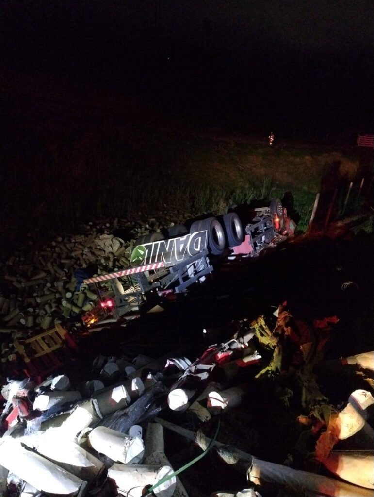 O capotamento envolveu um caminhão carregado com bobinas de papel e ocorreu por volta da 1h30, na altura do km 394.