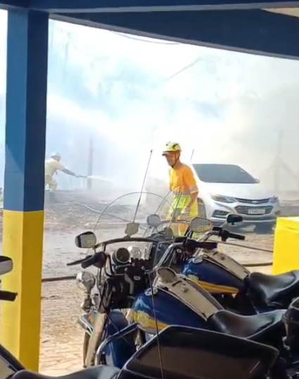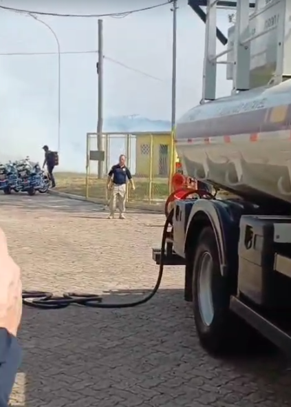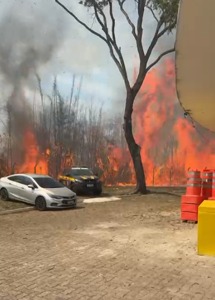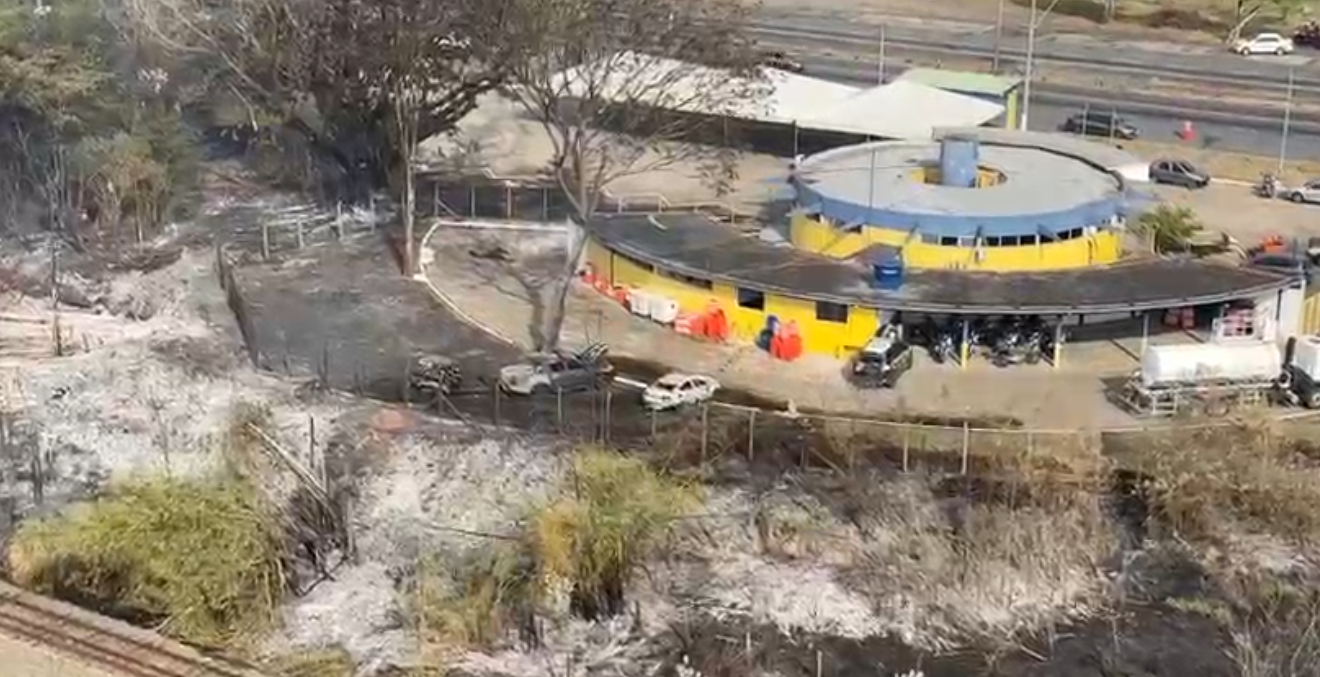 Um incêndio atingiu a área externa da Delegacia da Polícia Rodoviária Federal (PRF) em Roseira (SP) na tarde de domingo (6). O fogo teve início por volta das 13h45 em uma área de vegetação próxima à unidade e se alastrou rapidamente em direção ao pátio da delegacia.