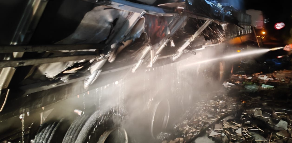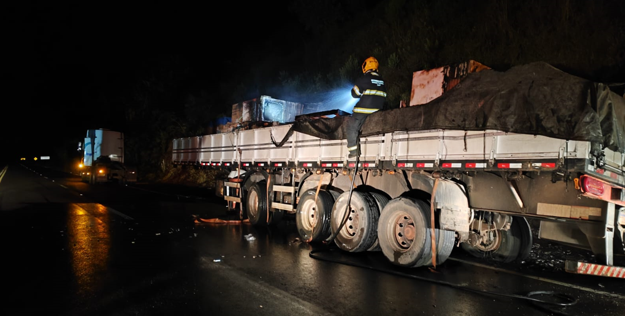 As chamas ficaram concentradas principalmente na carga, exigindo a atuação imediata dos bombeiros para evitar que o fogo se espalhasse por toda a carreta e causasse riscos maiores aos demais motoristas que trafegavam pela rodovia.