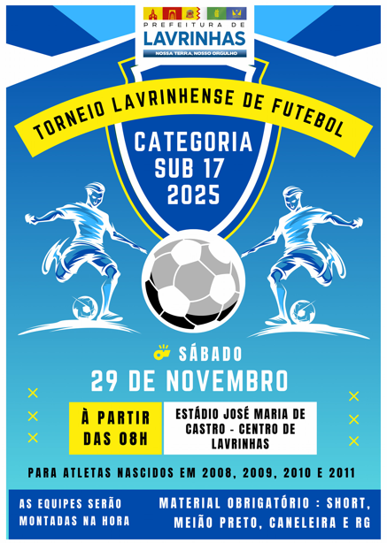 A Prefeitura de Lavrinhas, por meio da Secretaria de Esportes e Lazer, promove neste sábado (29) mais uma edição do Torneio Lavrinhense de Futebol na categoria Sub-17, voltada para adolescentes da cidade. O evento ocorrerá a partir das 8h no Estádio José Maria de Castro, localizado no Centro do município.
