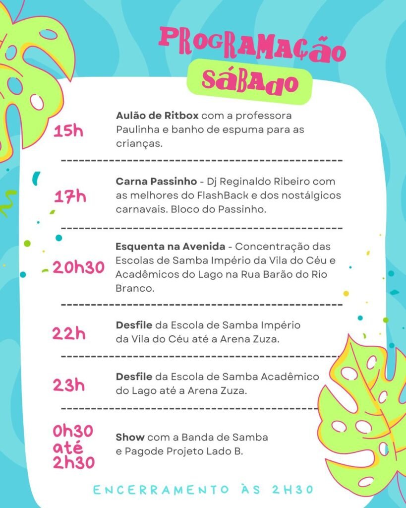 A programação cultural do Pré-Carnaval de Machado terá início no sábado, dia 7 de fevereiro, às 15 horas, na Arena Zuza, com aulão de Ritbox ministrado pela professora Paulinha, seguido de banho de espuma para as crianças. Às 17 horas acontece o Carna Passinho, com apresentação do DJ Reginaldo Ribeiro, trazendo sucessos do flashback e dos carnavais nostálgicos, acompanhado do Bloco do Passinho. Às 20h30 ocorre o esquenta na Avenida, com a concentração das Escolas de Samba Império da Vila do Céu e Acadêmicos do Lago na Rua Barão do Rio Branco. Às 22 horas, a Escola de Samba Império da Vila do Céu inicia seu desfile até a Arena Zuza, seguida, às 23 horas, pelo desfile da Escola de Samba Acadêmicos do Lago. Encerrando a programação do sábado, haverá show com a Banda de Samba e Pagode Projeto Lado B, das 0h30 até 2h30.