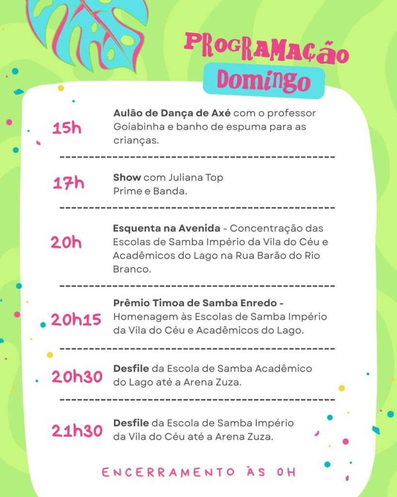 No domingo, dia 8 de fevereiro, a programação tem início às 15 horas com aulão de dança de axé com o professor Goiabinha e banho de espuma para as crianças, na Arena Zuza. Às 17 horas acontece o show com Juliana Top Prime e Banda. Às 20 horas ocorre novamente o esquenta na Avenida, com concentração das escolas de samba na Rua Barão do Rio Branco. Às 20h15 será realizada a entrega do Prêmio Timoa de Samba-Enredo, homenageando as escolas Império da Vila do Céu e Acadêmicos do Lago. Às 20h30 acontece o desfile da Escola de Samba Acadêmicos do Lago até a Arena Zuza e, às 21h30, o desfile da Escola de Samba Império da Vila do Céu, encerrando a programação do domingo à meia-noite.