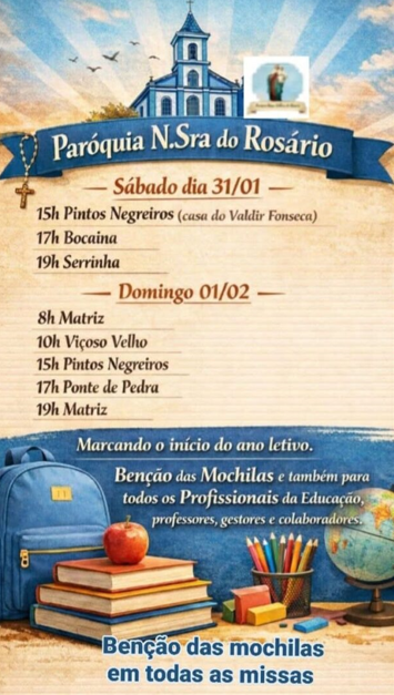 A Paróquia Nossa Senhora do Rosário, em Dom Viçoso, no sul de Minas Gerais, convida toda a comunidade para participar da Bênção das Mochilas, cerimônia religiosa que marca o início do ano letivo e incentiva estudantes, professores, gestores e colaboradores da educação a confiar seus desafios e expectativas a Deus.