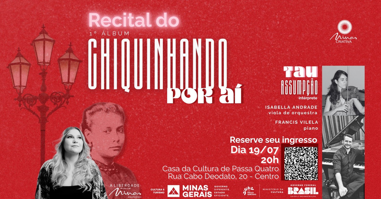 A Casa da Cultura de Passa-Quatro será palco de uma noite especial em homenagem à genialidade de Chiquinha Gonzaga, uma das maiores figuras da música brasileira. O recital “Chiquinhando por Aí” acontece no sábado, 19 de julho, às 19h30, com entrada gratuita mediante retirada antecipada de ingressos.