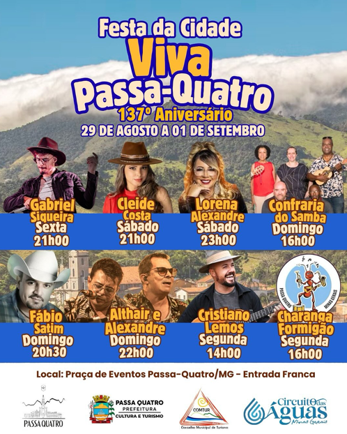 A Festa Viva Passa-Quatro acontece de sexta-feira (29) a segunda-feira (1º), em diversos pontos da cidade. A entrada é gratuita, e todos estão convidados a participar.