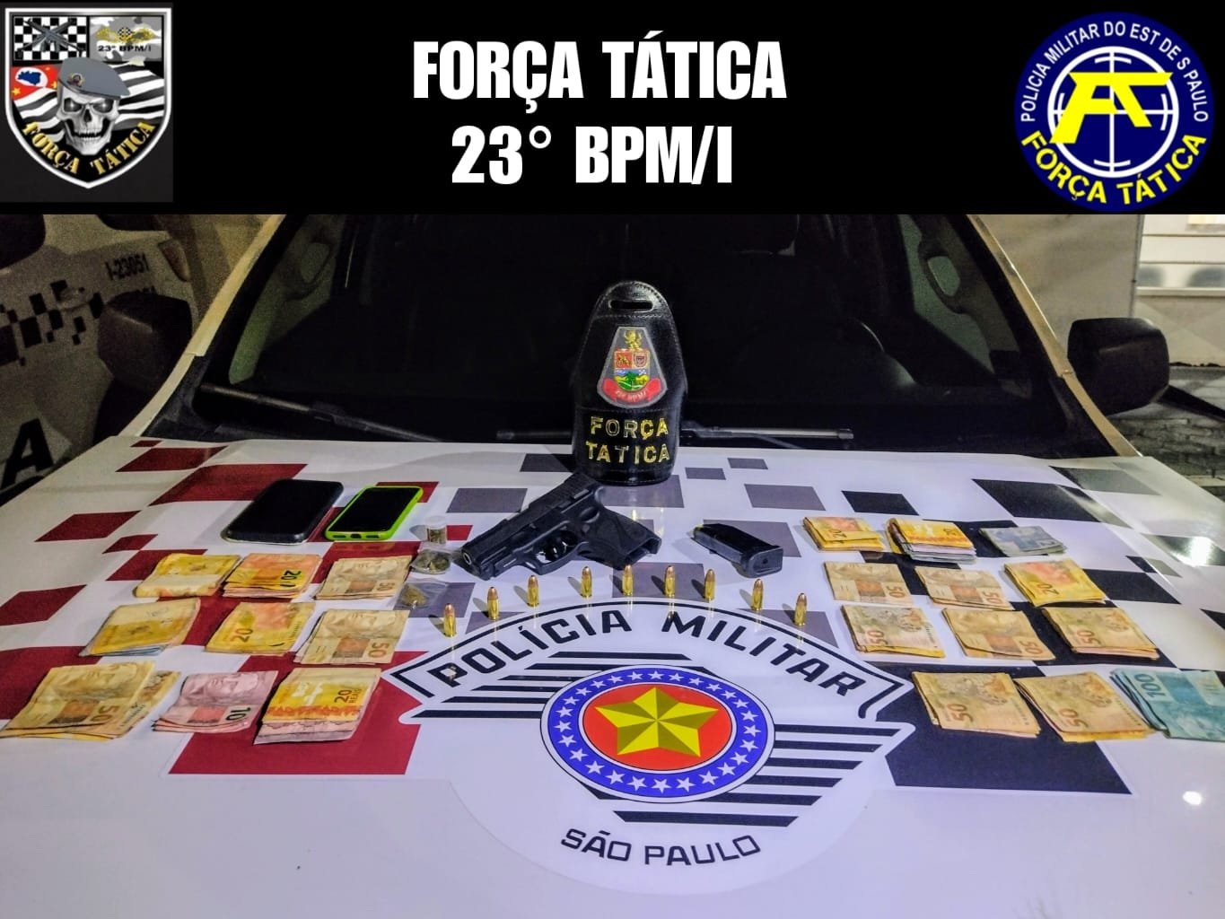 Durante a operação, as autoridades realizaram uma busca na residência onde o casal estava. No local, foram encontradas porções de maconha, uma quantidade em dinheiro, além de uma pistola Taurus 9mm com numeração suprimida municiada com 9 munições.