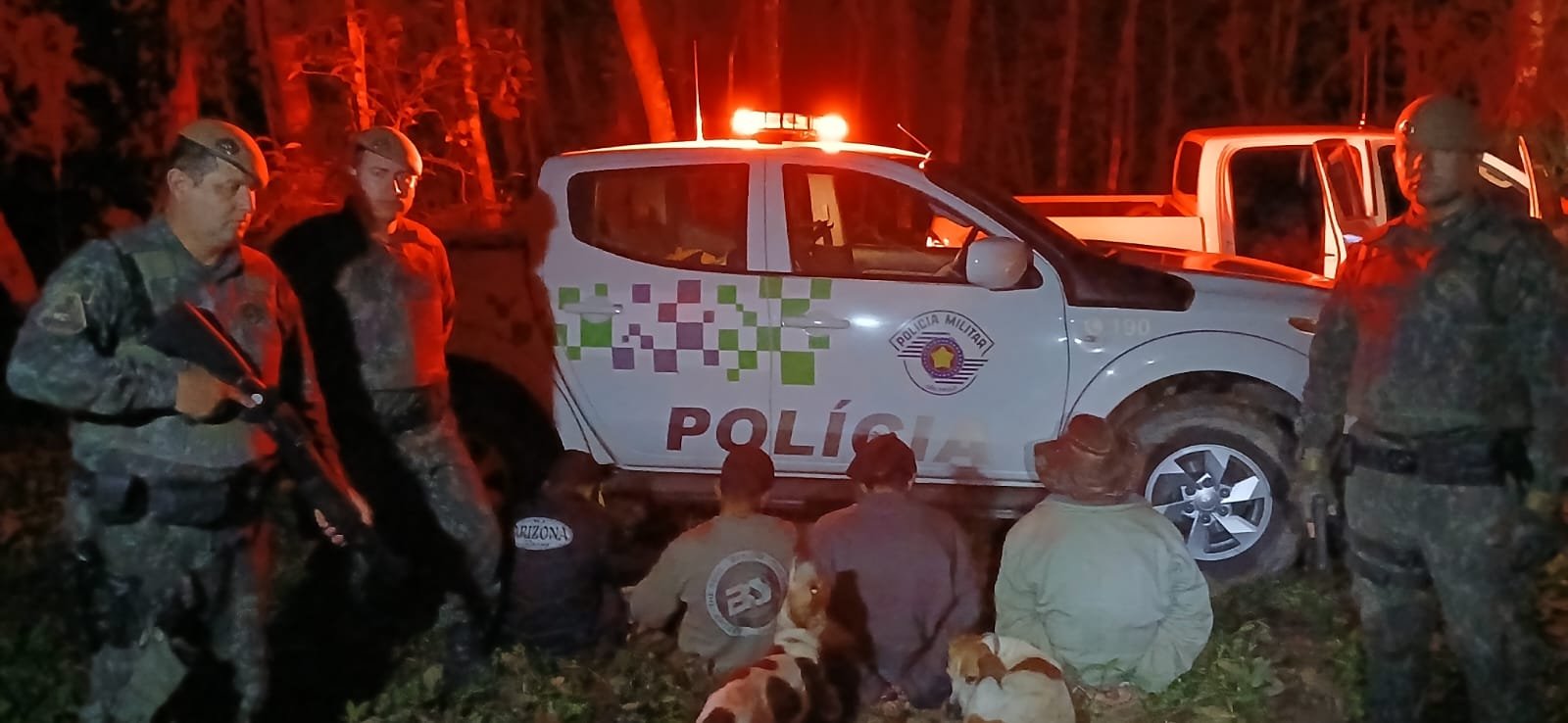 A equipe, acompanhada por dois guardas-parques, percorreu vários quilômetros da trilha quando percebeu movimentações e vozes. Dois homens foram abordados no local. No momento da abordagem, os suspeitos soltaram dois cães da raça Beagle Americano, utilizados para a caça, capturados posteriormente pelos guardas-parques.