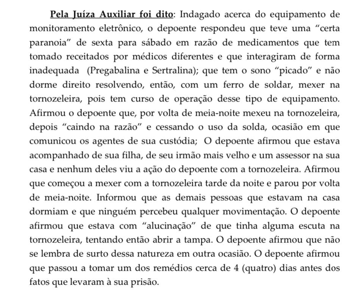 – Bolsonaro admitiu que utilizou um ferro de solda para tentar abrir a tornozeleira. Segundo ele, o motivo foi “curiosidade”.