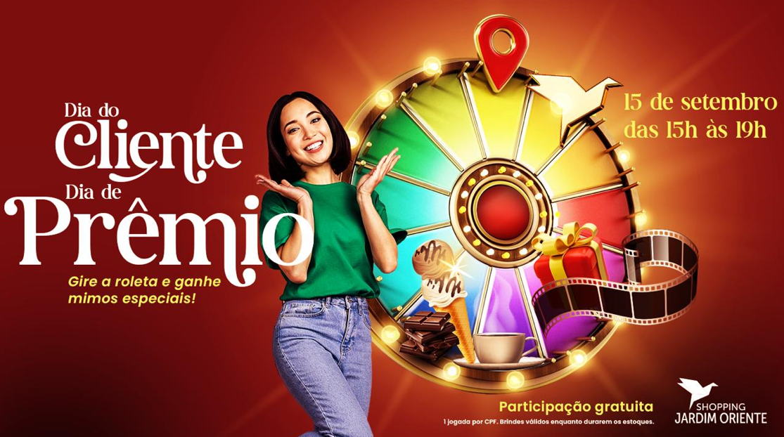 O Shopping Jardim Oriente, em São José dos Campos, irá comemorar o Dia do Cliente, no próximo dia 15 de setembro (segunda-feira), das 15h às 19h, com a Roleta de Prêmios, localizada próxima a Portaria Tsuru. Para participar, os clientes realizarão um cadastro no momento da atividade, é válido uma brincadeira por CPF. A diversão é gratuita e disponível para todos que estiverem no centro de compras neste período.