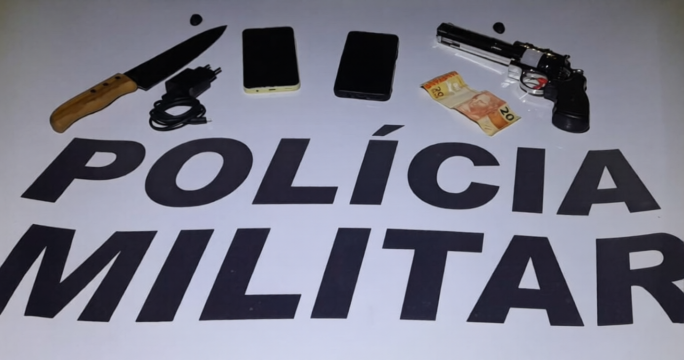 Suspeitos foram localizados pela Polícia Militar durante patrulhamento; réplica de arma, faca e aparelho da vítima foram apreendidos