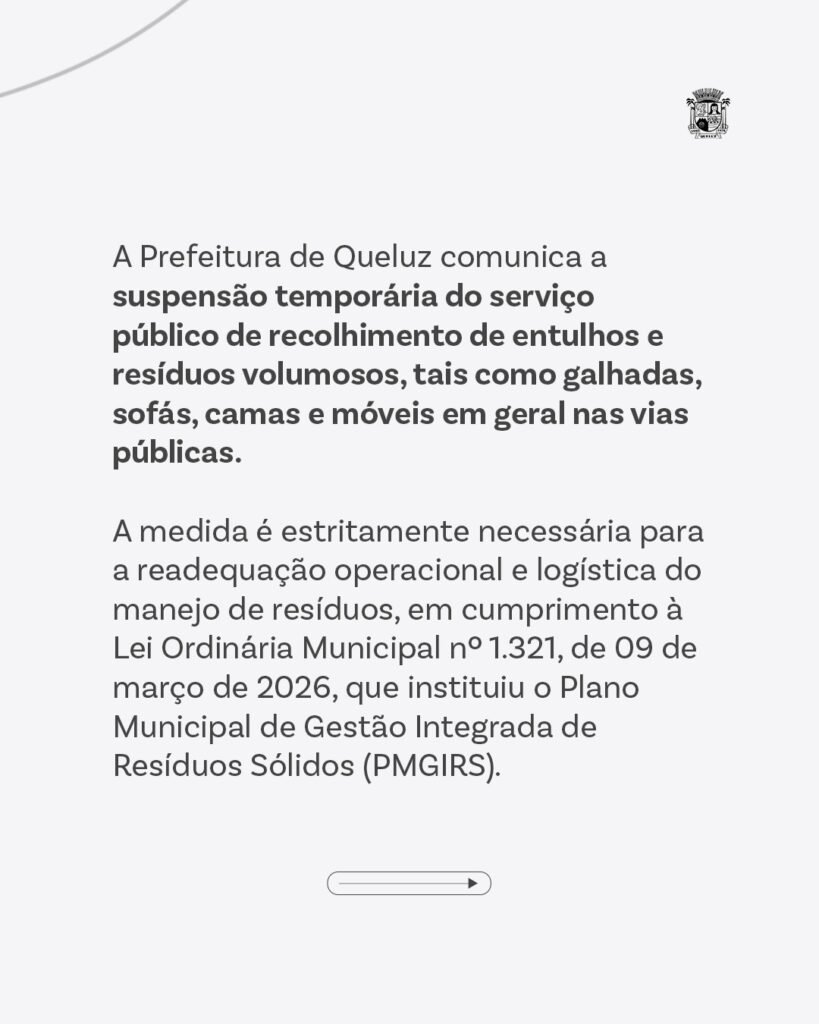 A prefeitura de Queluz anunciou, na última terça-feira (24), a suspensão temporária do serviço de recolhimento de entulhos e resíduos volumosos no município. A informação foi divulgada por meio das redes sociais oficiais da administração municipal.