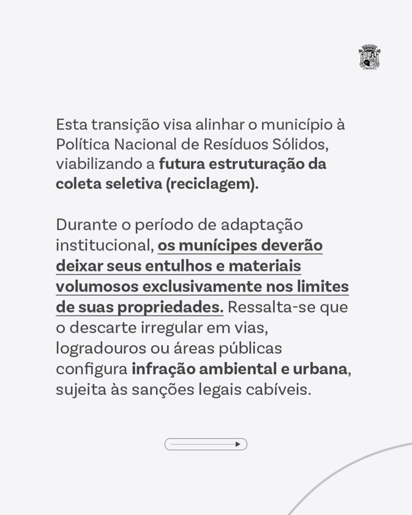 Durante o período de transição, a orientação é que os moradores mantenham entulhos e materiais volumosos dentro dos limites de suas propriedades. O descarte em vias públicas, praças ou outros espaços urbanos continua proibido e pode resultar em sanções previstas na legislação ambiental e urbana.