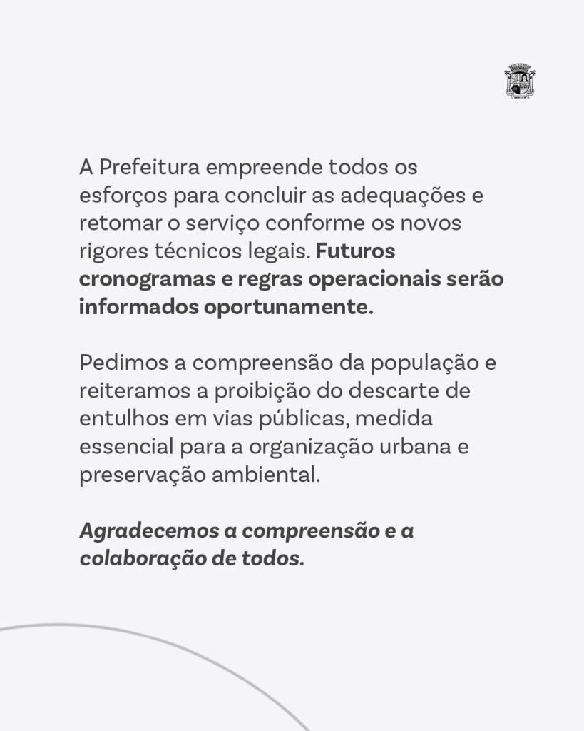 Até o momento, não há prazo oficial para o retorno da coleta. A administração municipal reforçou o pedido de colaboração da população e destacou que a reorganização do sistema é necessária para melhorar a gestão de resíduos no município a longo prazo.