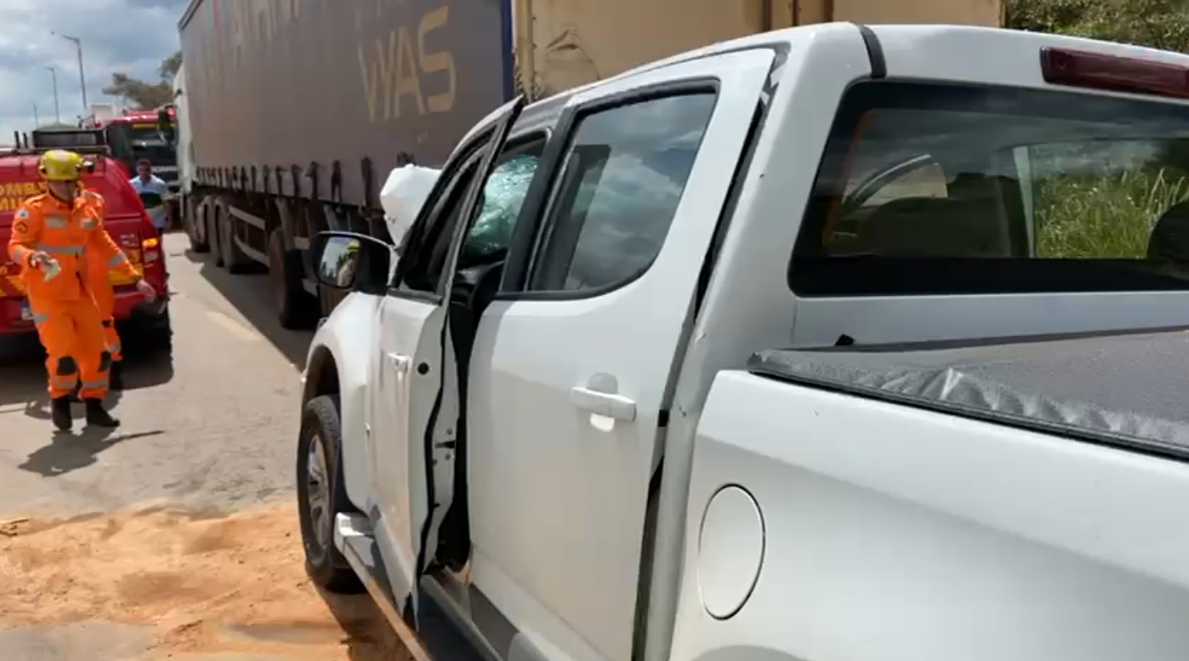 Acidente entre caminhonete e carreta mobiliza socorro na LMG-877, em Poços de Caldas, MG