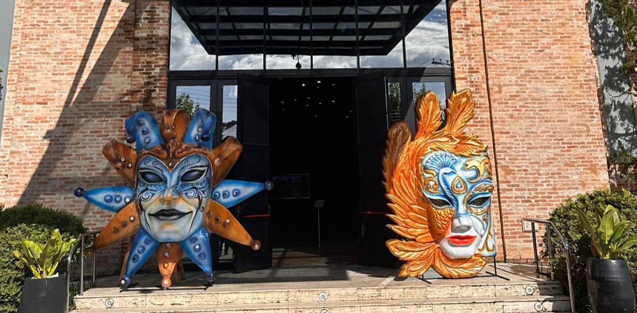 Máscaras gigantes da Dragões da Real transformam o Campos Hall em espetáculo carnavalesco em Campos do Jordão, SP
